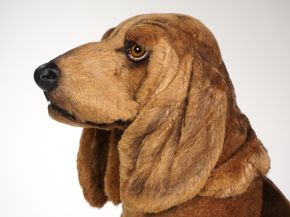 This astonishingly lifelike Bloodhound, a reduced-size model, is one of a family of seven created by the master artisans of Piutrè Italy. The synthetic, soft-to-the-touch plush is true to life, even replicating the loosely folded skin from the head to below the neck that's so characteristic of the breed. Each piece is hand-trimmed and hand-finished for an exceptional degree of realism. The tag on this Bloodhound, individually signed by a member of the Angeli family, is your hallmark of the uncompromising artistry and craftsmanship that go into the making of each Piutrè animal.