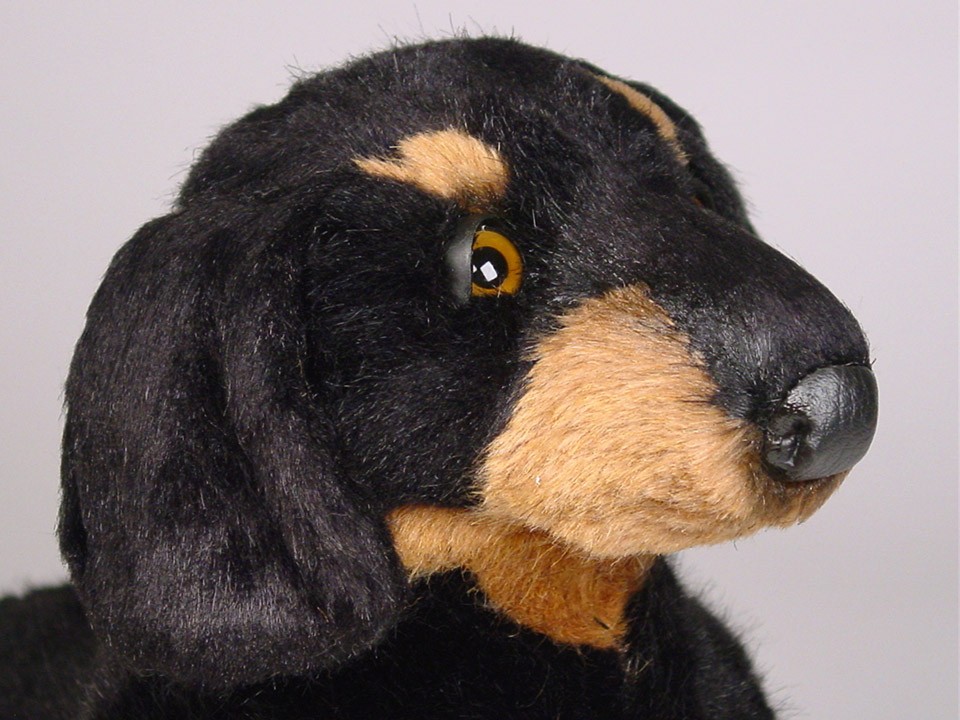 This astonishingly lifelike puppy is one of a family of five Smooth Dachshunds created by the master artisans of Piutrè Italy. The synthetic, soft-to-the-touch plush is true to life, in the characteristically smooth, black-and-tan coat of the breed. Each piece is hand-trimmed and hand-finished for an exceptional degree of realism. The tag on this Dachshund Puppy, individually signed by a member of the Angeli family, is your hallmark of the uncompromising artistry and craftsmanship that go into the making of each Piutrè animal.
